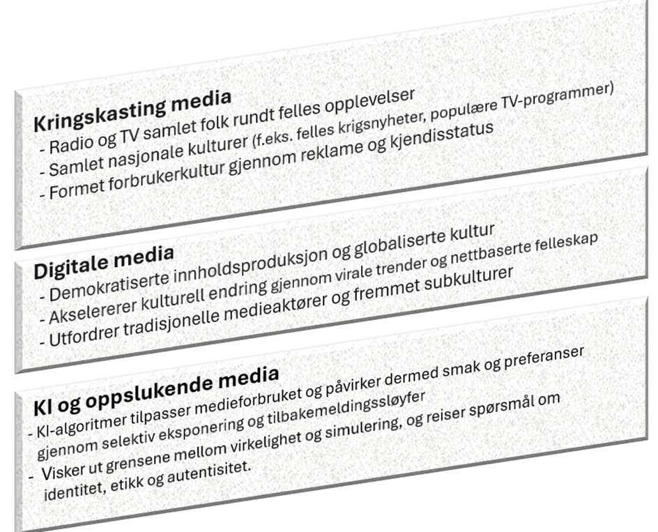 I presentasjonen under finner du gjennomgang av utvalgte aspekter relatert til forbindelsen mellom utviklingen av medieteknologi og kulturelle fenomener. Trykt kultur, visuell kultur og deltakerkultur – som presentasjonen tar for seg – er eksempler på hvordan bruk av spesifikke medietyper – som henholdsvis trykte tekster, visuelle uttrykk og digitale, interaktive plattformer – har bidratt til utvikling og endring av kulturelle praksiser over tid.