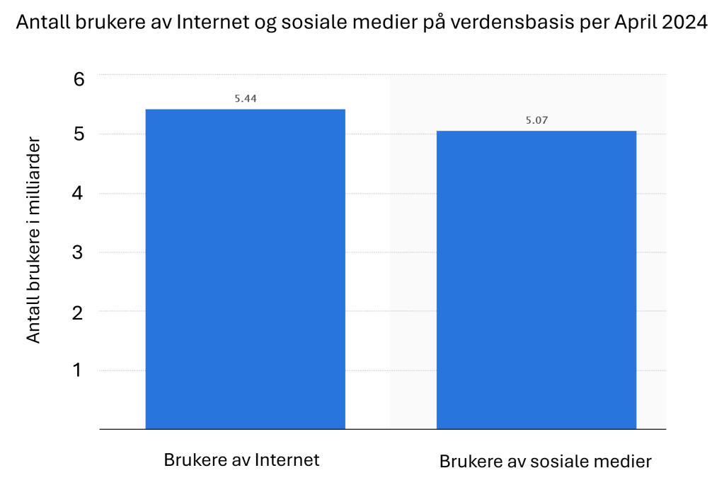 Basert på statistikk fra Statista, 2024, benytter 5.o7 milliarder mennesker sosiale medier i 2024, som tilsvarer 62.06% av verdens befolkning. Vi har så langt sett en jevn økning i bruken av sosiale medier over år og det antas at dette fortsetter.