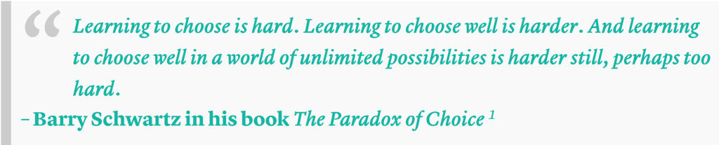 I dagens informasjonsmettede samfunn er overfloden av informasjon kommet for å bli. Mengden (kanskje for mange?) av nyhetsstrømmer, infografikk, sosiale medier, osv. setter store krav til vår tid og oppmerksomhet. Den eksplosjonsartede mengden av valg kan være paralyserende, og vi ender opp for forvirret til å velge – et fenomen som kalles valgparadokset (The Paradox of Choice).