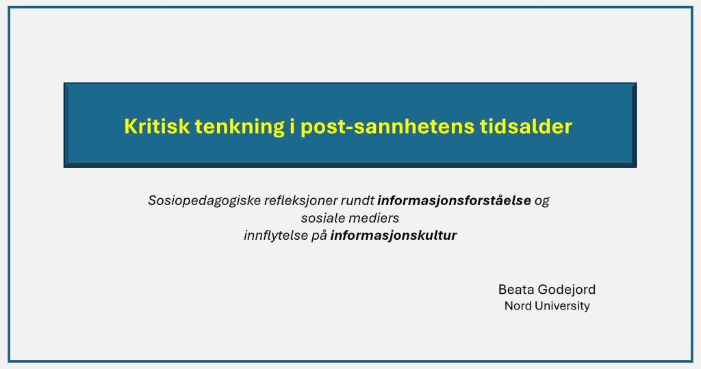 Presentasjonen under utforsker hvordan post-sannhetskulturen utfordrer vår evne til å tenke kritisk, og hvordan personlige skjevheter og sosiale mekanismer forsterker feiloppfatninger. Med et sosiopedagogisk blikk belyses behovet for mediekompetanse, refleksjon og kritisk tenkning som nøkkelkompetanser i møte med dagens digitale informasjonskultur.